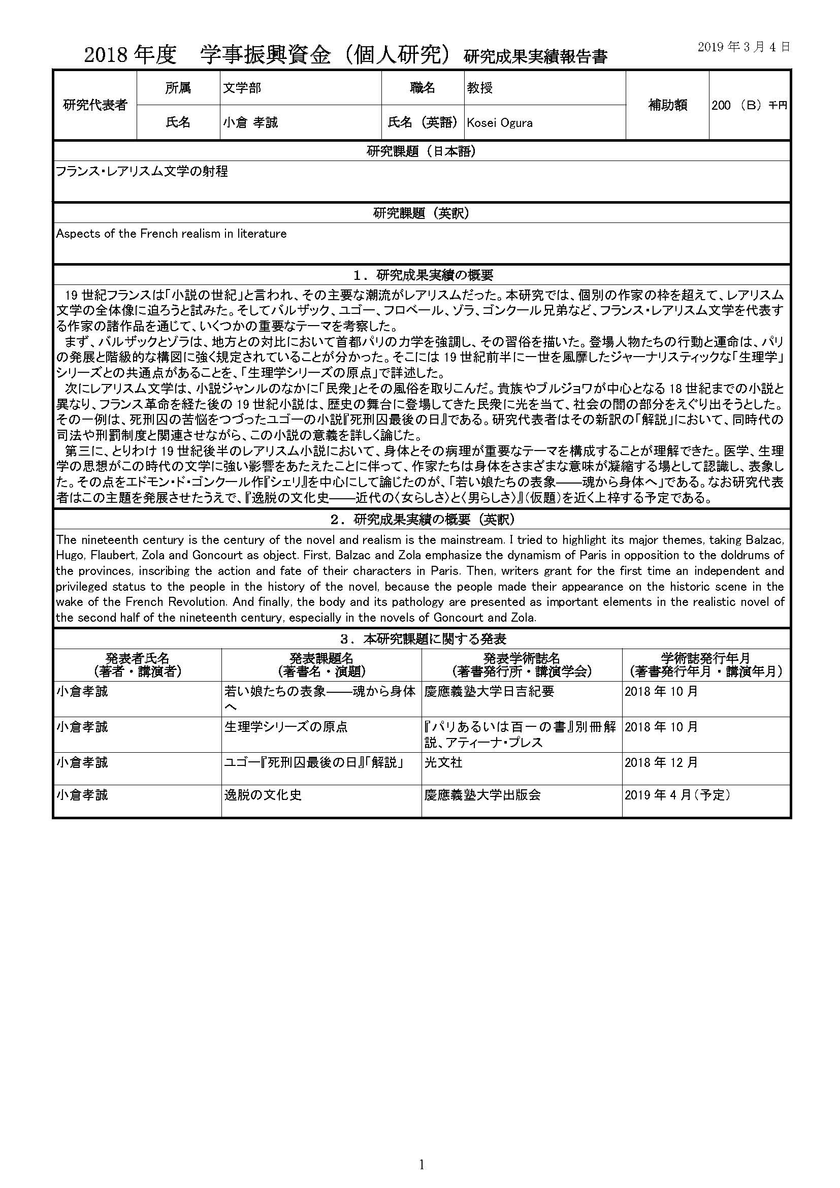 19世紀フランスは「小説の世紀」と言われ、その主要な潮流がレアリスムだった。本研究では、個別の作家の枠を超えて、レアリスム文学の全体像に迫ろうと試みた。そしてバルザック、ユゴー、フロベール、ゾラ、ゴンクール兄弟など、フランス・レアリスム文学を代表する作家の諸作品を通じて、いくつかの重要なテーマを考察した。