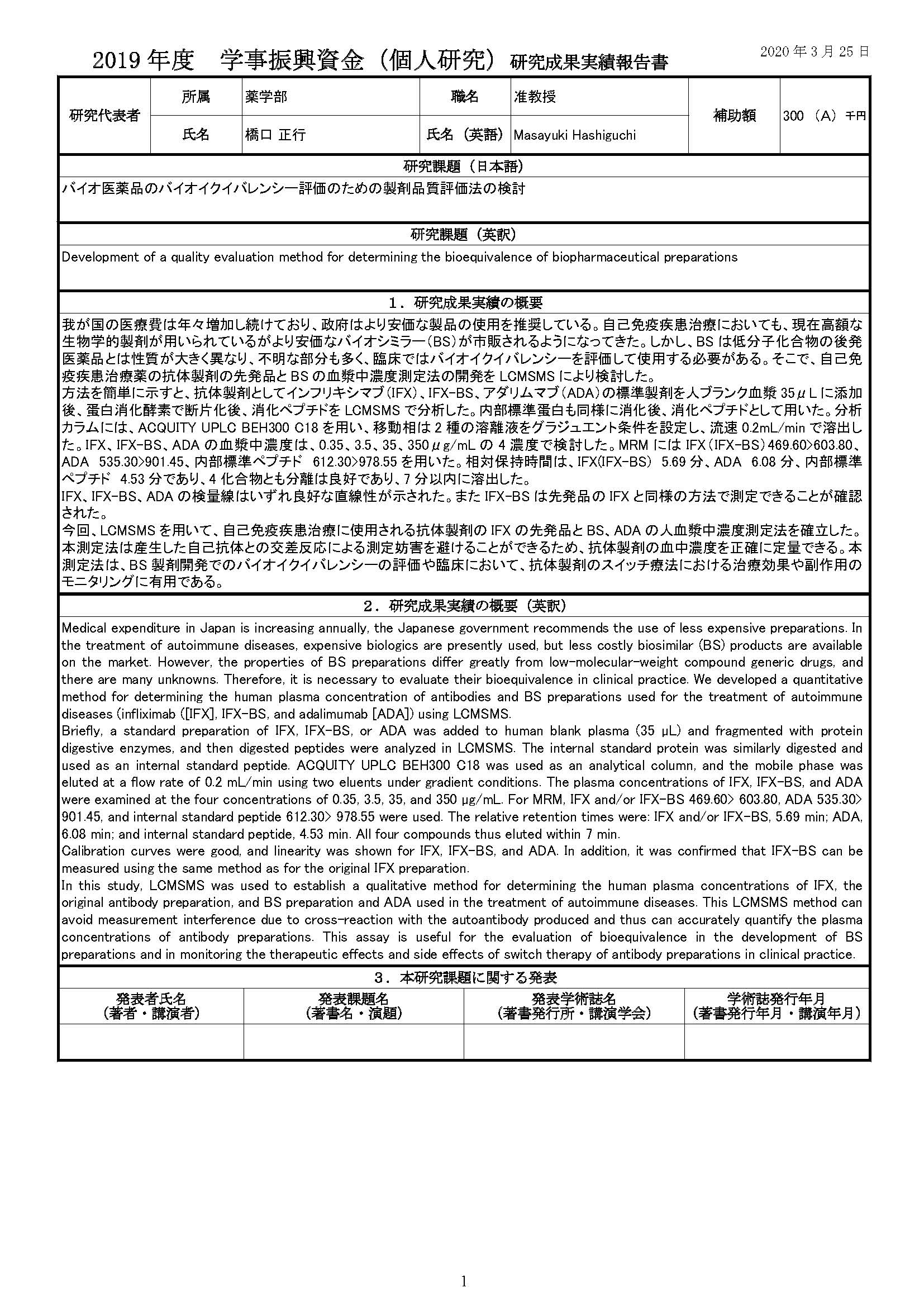 今回、LCMSMSを用いて、自己免疫疾患治療に使用される抗体製剤のIFXの先発品とBS、ADAの人血漿中濃度測定法を確立した。本測定法は産生した自己抗体との交差反応による測定妨害を避けることができるため、抗体製剤の血中濃度を正確に定量できる。本測定法は、BS製剤開発でのバイオイクイバレンシーの評価や臨床において、抗体製剤のスイッチ療法における治療効果や副作用のモニタリングに有用である。
