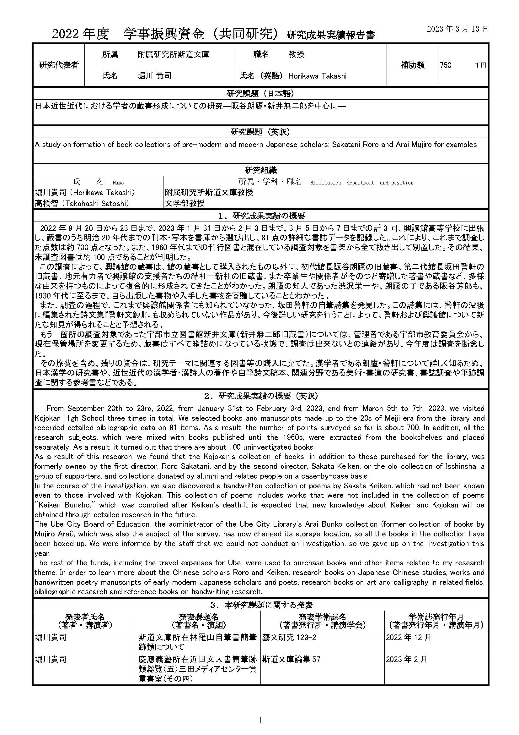 2022年9月20日から23日まで、2023年1月31日から2月3日まで、3月5日から7日までの計3回、興譲館高等学校に出張し、蔵書のうち明治20年代までの刊本・写本を書庫から選び出し、81点の詳細な書誌データを記録した。これにより、これまで調査した点数は約700点となった。また、1960年代までの刊行図書と混在している調査対象を書架から全て抜き出して別置した。その結果、未調査図書は約100点であることが判明した。