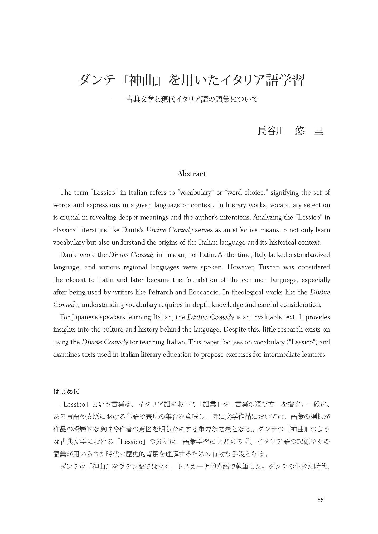 For Japanese speakers learning Italian, the Divine Comedy is an invaluable text. It provides insights into the culture and history behind the language. Despite this, little research exists on using the Divine Comedy for teaching Italian. This paper focuses on vocabulary (“Lessico”) and examines texts used in Italian literary education to propose exercises for intermediate learners.
