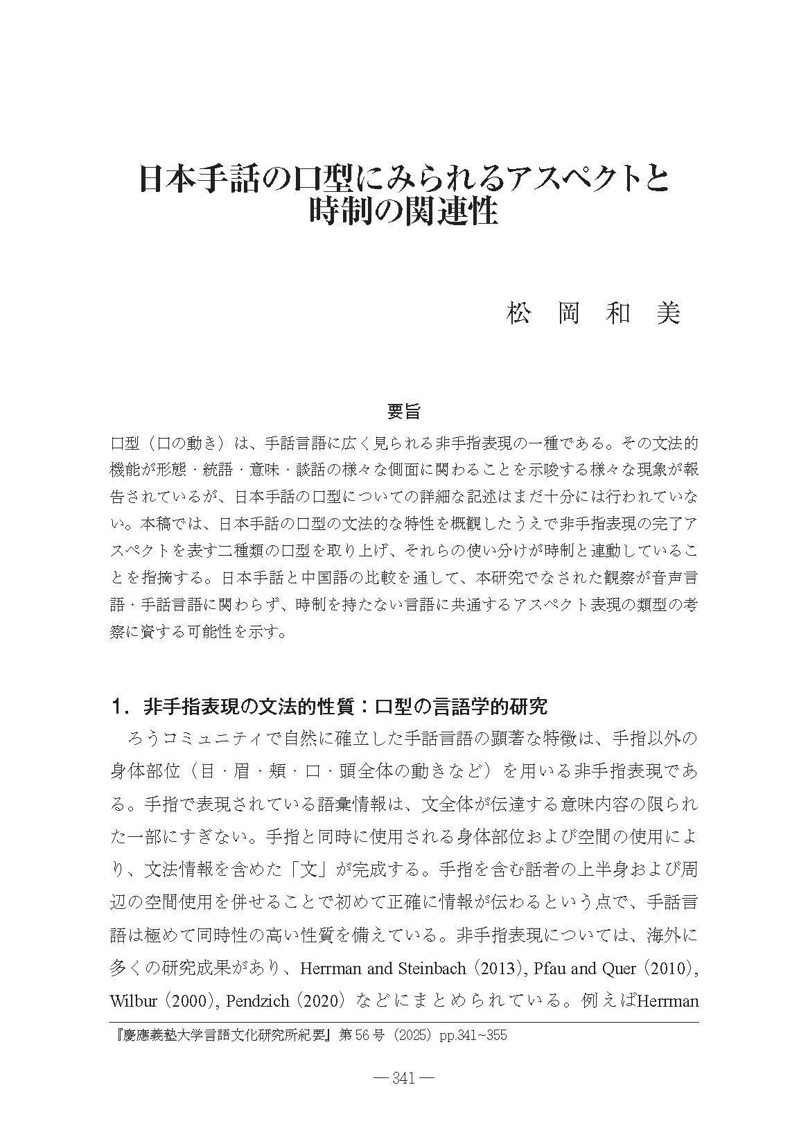 口型(口の動き)は、手話言語に広く見られる非手指表現の一種である。その文法的機能が形態・統語・意味・談話の様々な側面に関わることを示唆する様々な現象が報告されているが、日本手話の口型についての詳細な記述はまだ十分には行われていない。本稿では、日本手話の口型の文法的な特性を概観したうえで非手指表現の完了アスペクトを表す二種類の口型を取り上げ、それらの使い分けが時制と連動していることを指摘する。日本手話と中国語の比較を通して、本研究でなされた観察が音声言語・手話言語に関わらず、時制を持たない言語に共通するアスペクト表現の類型の考察に資する可能性を示す。