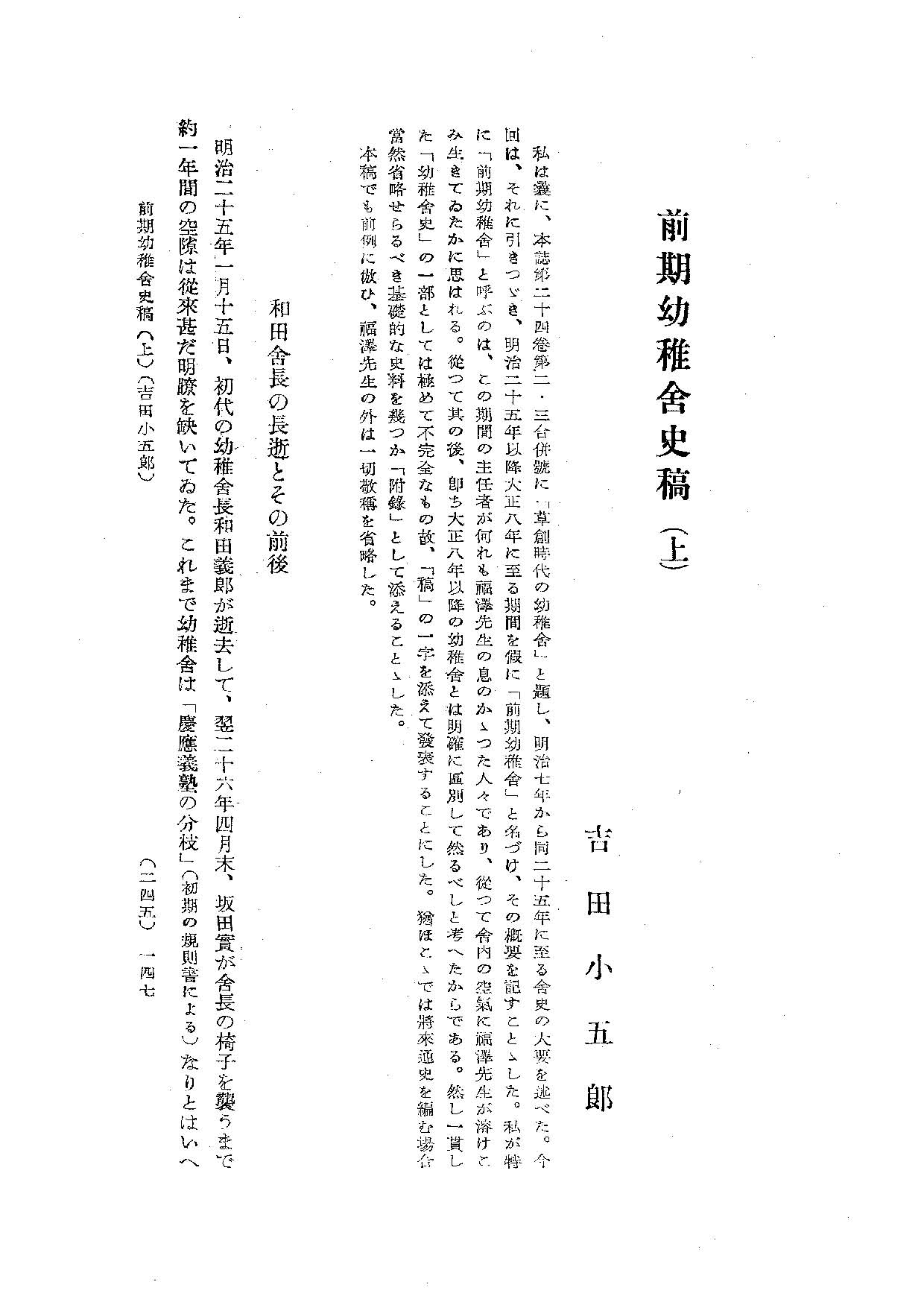 私は曩に、本誌第二十四巻第二・三合併號に「草創時代の幼稚舎」と題し、明治七年から同二十五年に至る舎史の大要を述べた。今回は、それに引きつゞき、明治二十五年以降大正八年に至る期間を假に「前期幼稚舎」と名づけ、その概要を記すことゝした。私が特に「前期幼稚舎」と呼ぶのは、この期間の主任者が何れも福澤先生の息のかゝつた人々であり、從つて舎内の空氣に福澤先生が溶けこみ生きてゐたかに思はれる。從つて其の後、即ち大正八年以降の幼稚舎とは明確に区別して然るべしと考へたからである。然し一貫した「幼稚舎史」の一部としては極めて不完全なもの故、「稿」の一字を添えて發表することにした。猶ほこゝでは將來通史を編む場含當然省略せらるべき基礎的な史料を幾つか「附録」として添えることゝした。本稿でも前例に倣ひ、福澤先生の外は一切敬称を省略した。
