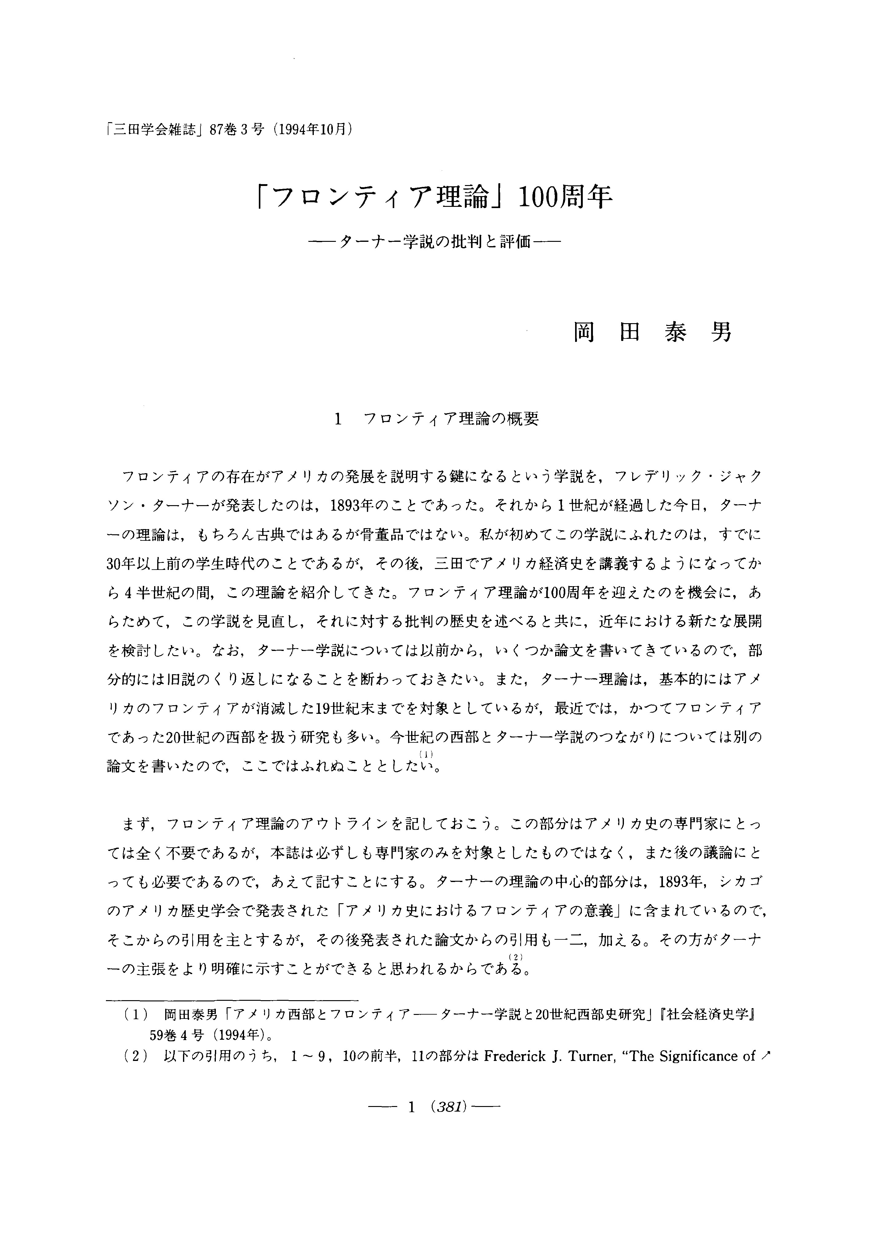 「フロンティア理論」100周年 : ターナー学説の批判と評価