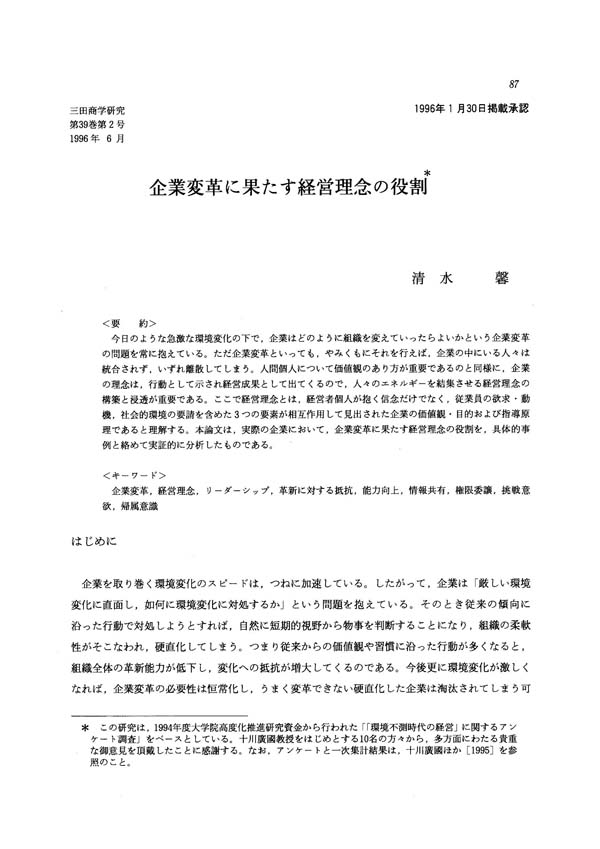 今日のような急激な環境変化の下で,企業はどのように組織を変えていったらよいかという企業変革の問題を常に抱えている。ただ企業変革といっても,やみくもにそれを行えば,企業の中にいる人々は統合されず,いずれ離散してしまう。人間個人について価値観のあり方が重要であるのと同様に,企業の理念は,行動として示され経営成果として出てくるので,人々のエネルギーを結集させる経営理念の構築と浸透が重要である。ここで経営理念とは,経営者個人が抱く信念だけでなく,従業員の欲求・動機,社会的環境の要請を含めた3つの要素が相互作用して