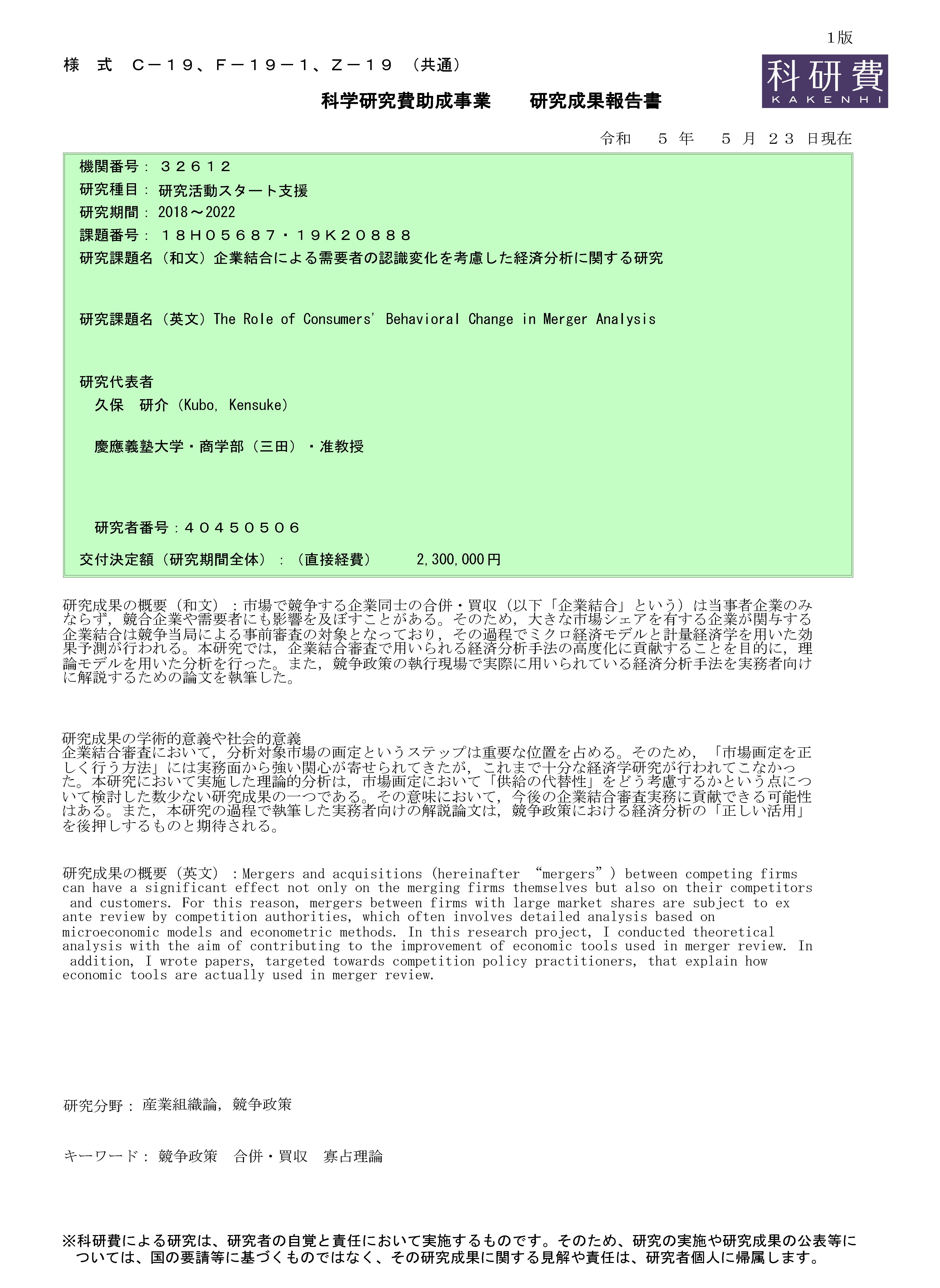 市場で競争する企業同士の合併・買収(以下「企業結合」という)は当事者企業のみならず,競合企業や需要者にも影響を及ぼすことがある。そのため,大きな市場シェアを有する企業が関与する企業結合は競争当局による事前審査の対象となっており,その過程でミクロ経済モデルと計量経済学を用いた効果予測が行われる。本研究では,企業結合審査で用いられる経済分析手法の高度化に貢献することを目的に,理論モデルを用いた分析を行った。また,競争政策の執行現場で実際に用いられている経済分析手法を実務者向けに解説するための論文を執筆した。