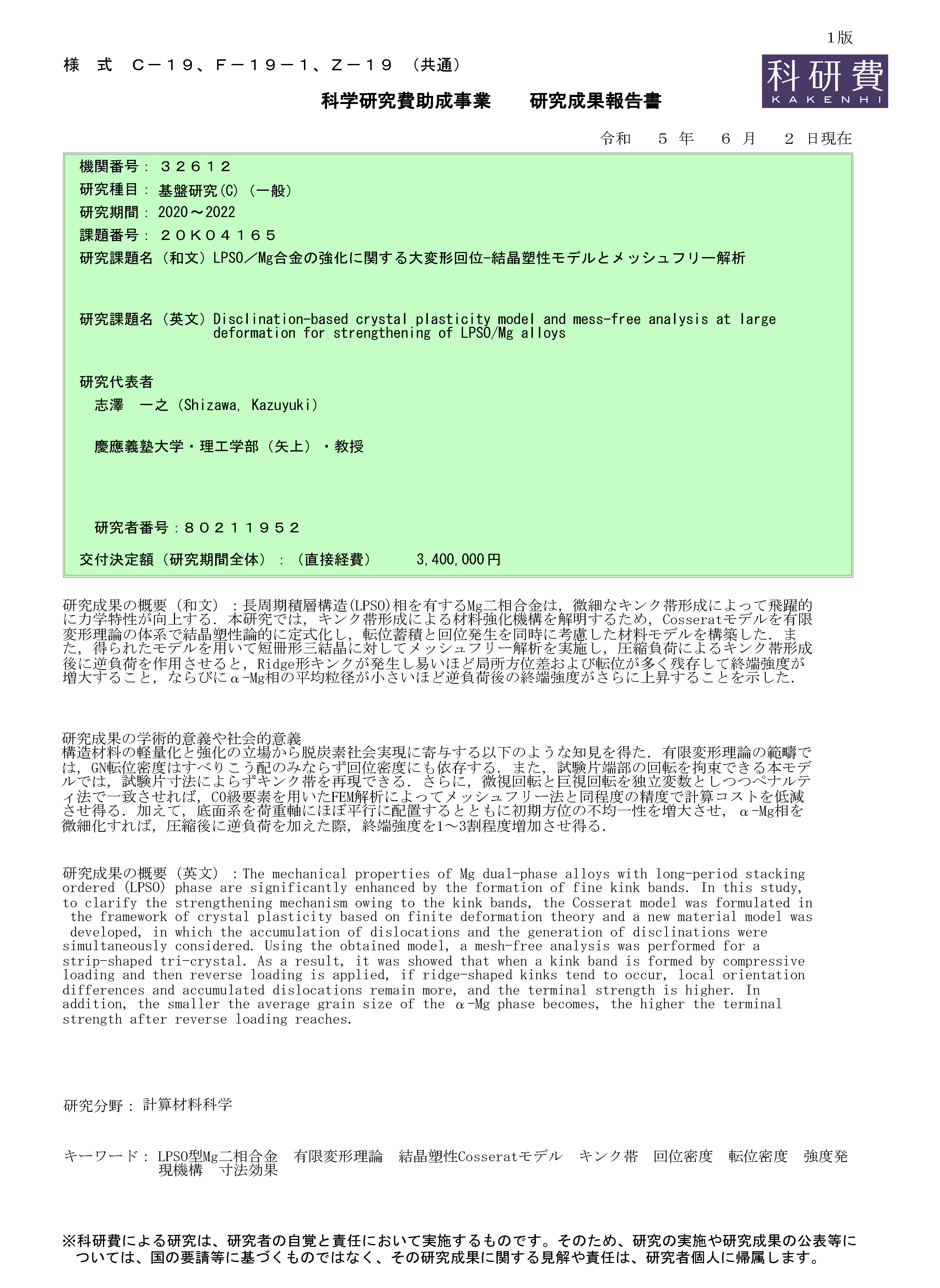 LPSO/Mg合金の強化に関する大変形回位-結晶塑性モデルとメッシュフリー解析