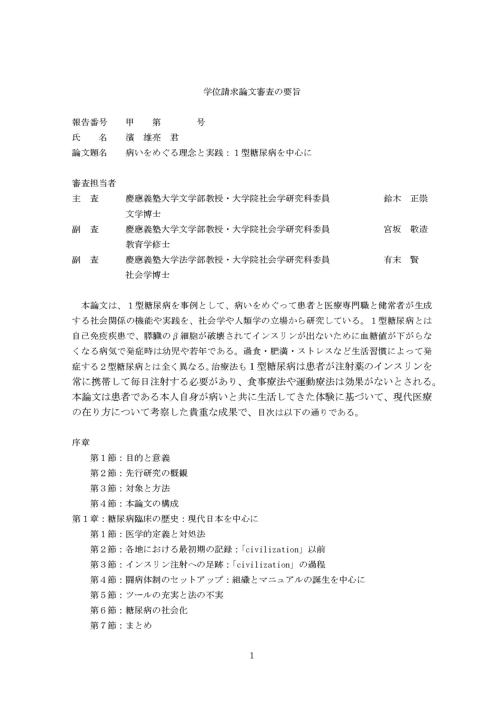 病いをめぐる理念と実践 : 1型糖尿病を中心に(審査報告)