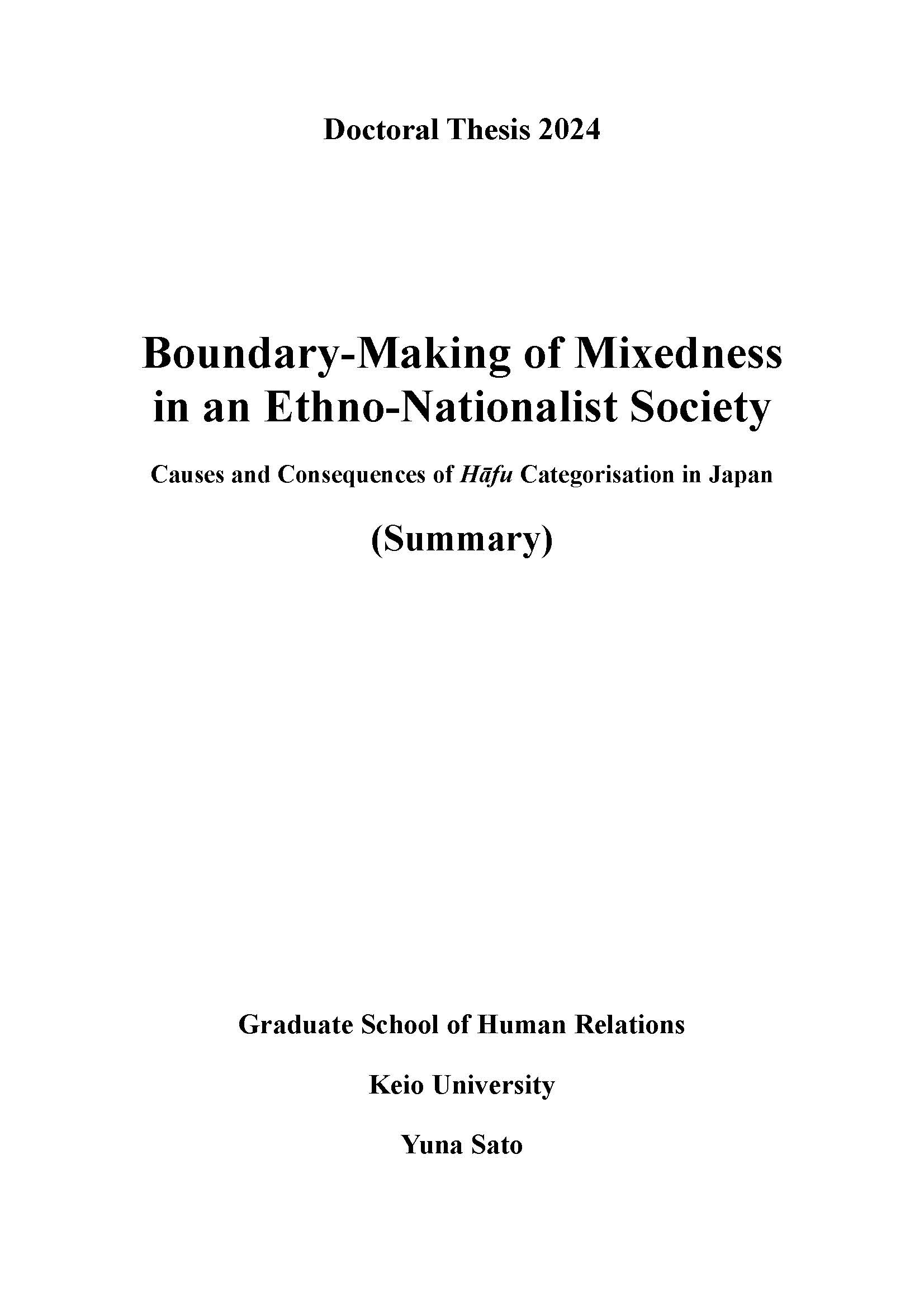 Boundary-making of mixedness in an ethno-nationalist society : causes and consequences of hāfu categorisation in Japan (要約)