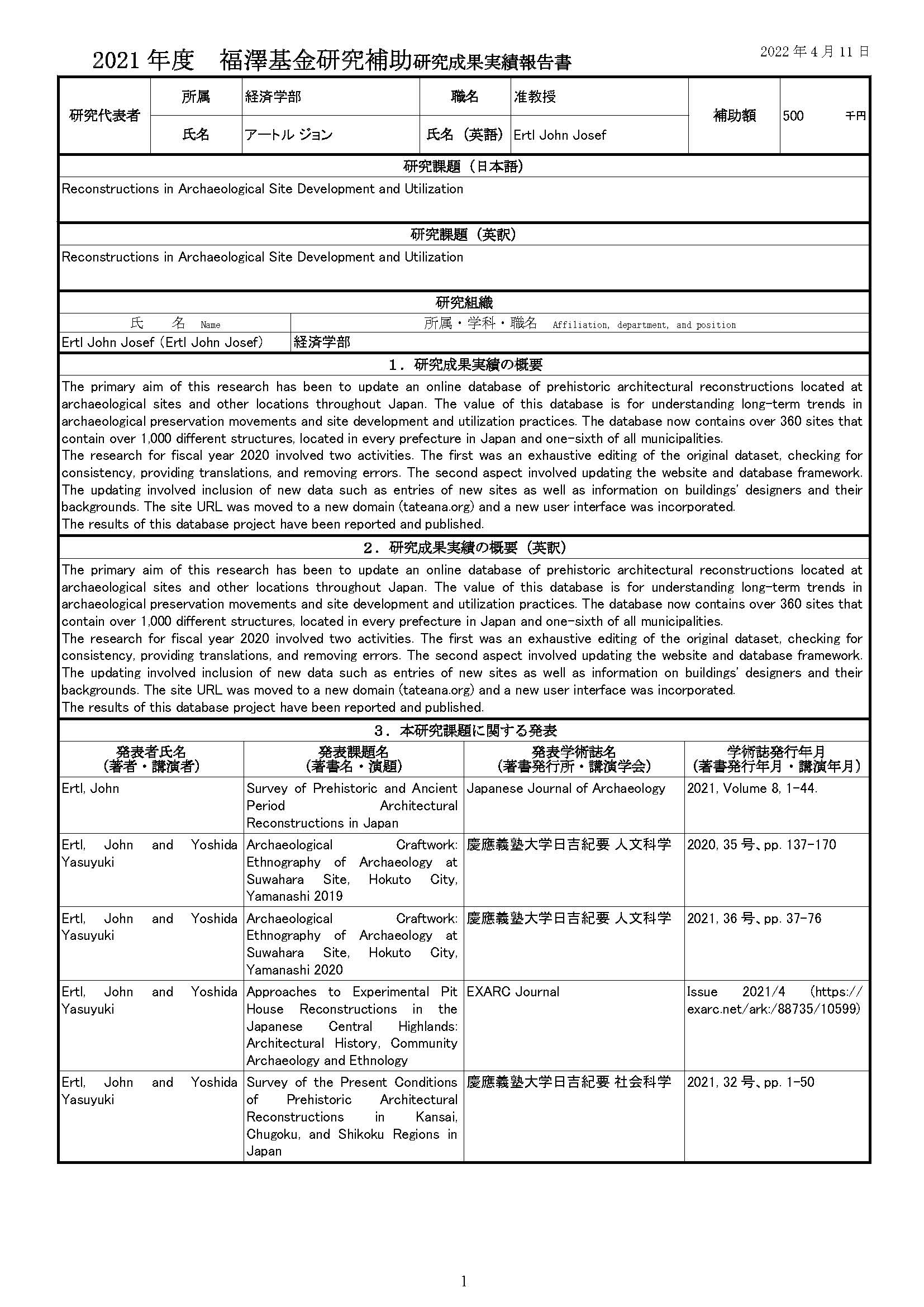 The primary aim of this research has been to update an online database of prehistoric architectural reconstructions located at archaeological sites and other locations throughout Japan. The value of this database is for understanding long-term trends in archaeological preservation movements and site development and utilization practices. The database now contains over 360 sites that contain over 1,000 different structures, located in every prefecture in Japan and one-sixth of all municipalities.