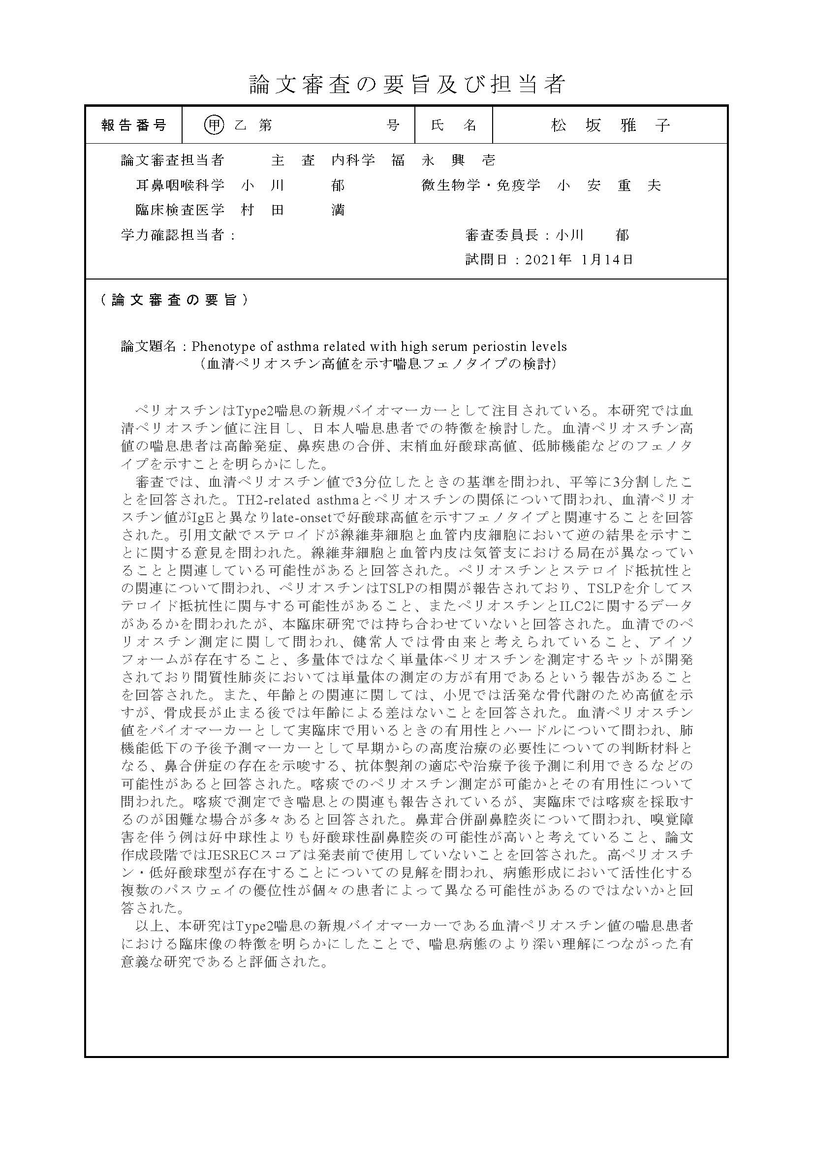 Phenotype of asthma related with high serum periostin levels (審査報告)