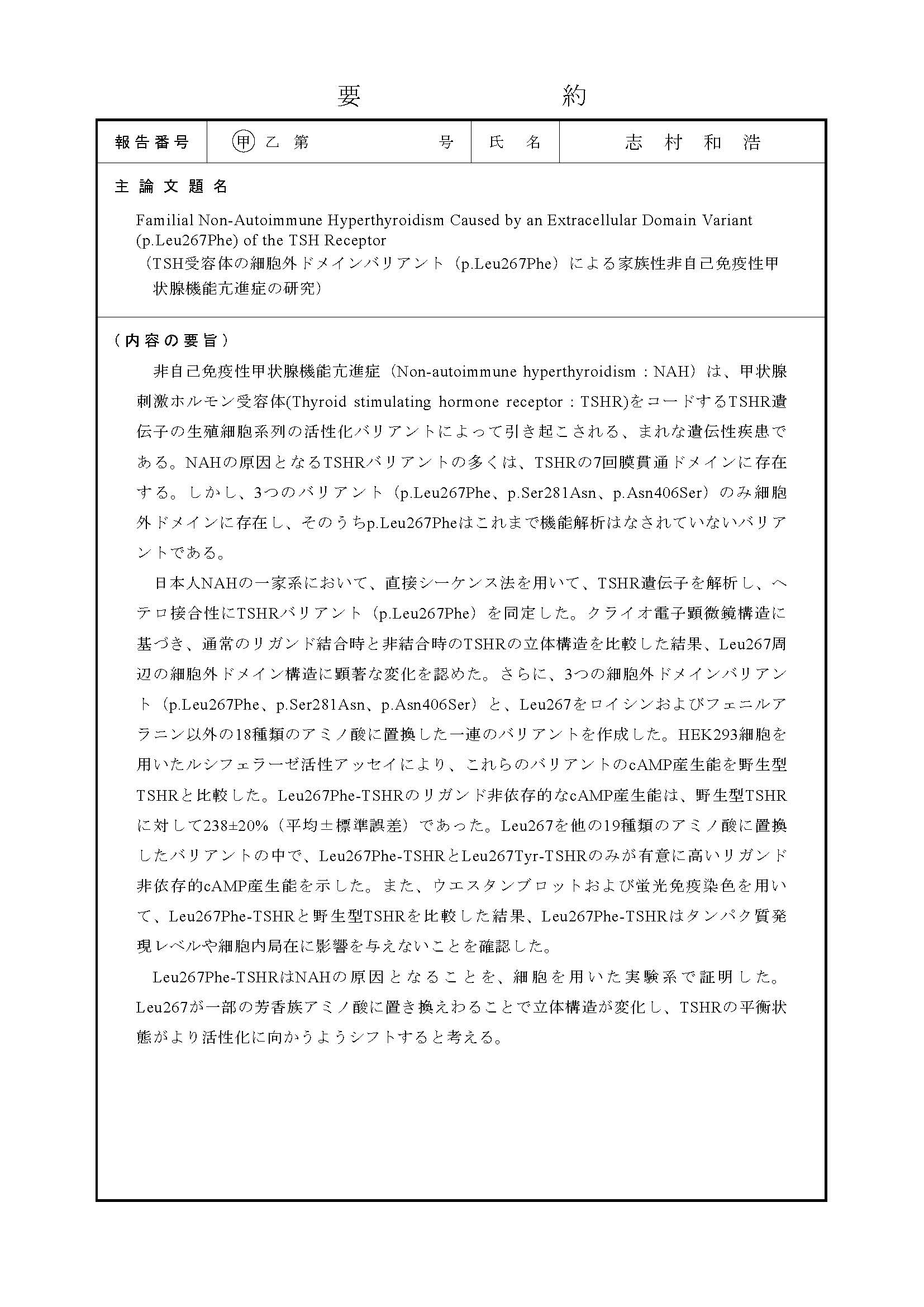 TSH juyōtai no saibōgai domein barianto (p.Leu267Phe) ni yoru kazokusei hijiko men'ekisei kōjōsen kinō kōshinshō no kenkyū