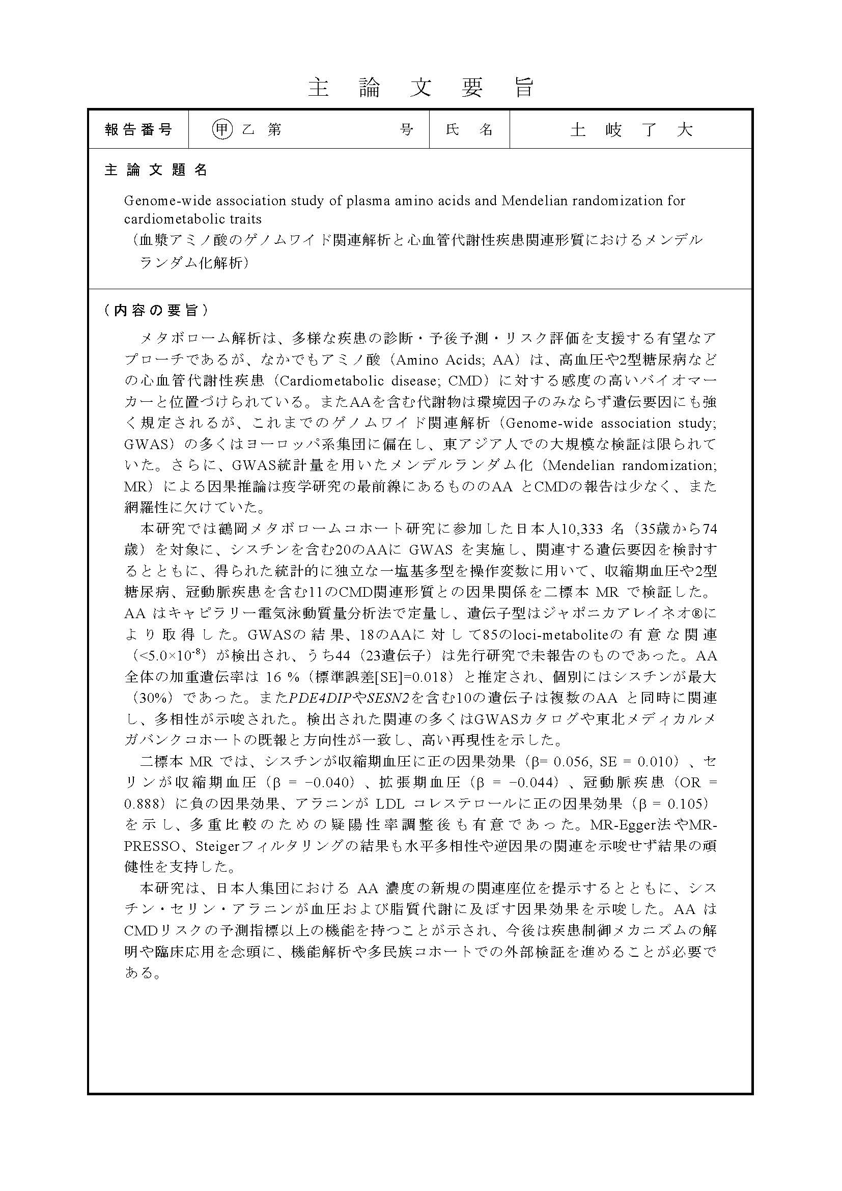 Genome-wide association study of plasma amino acids and Mendelian randomization for cardiometabolic traits (要旨)