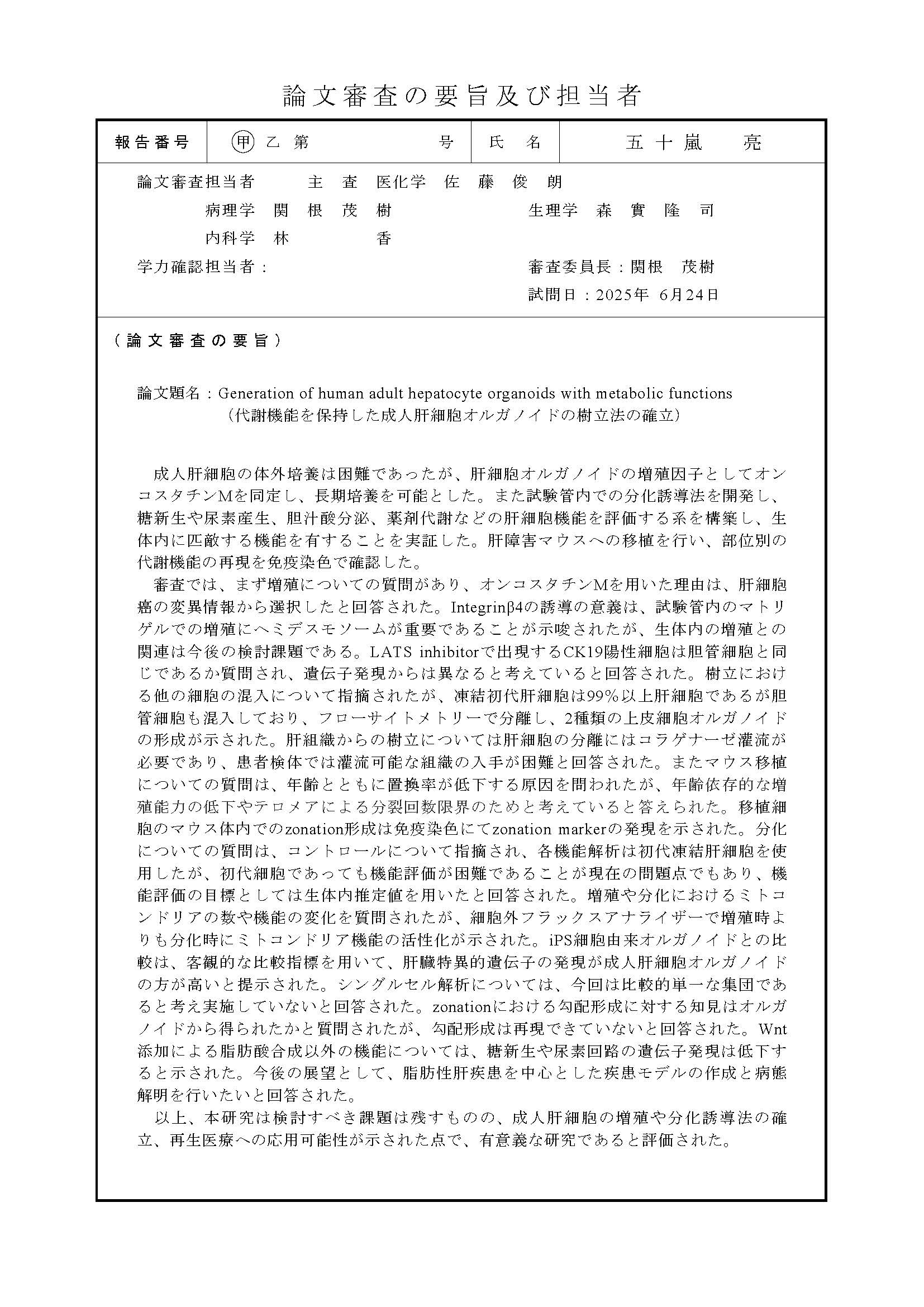 Generation of human adult hepatocyte organoids with metabolic functions (審査報告)